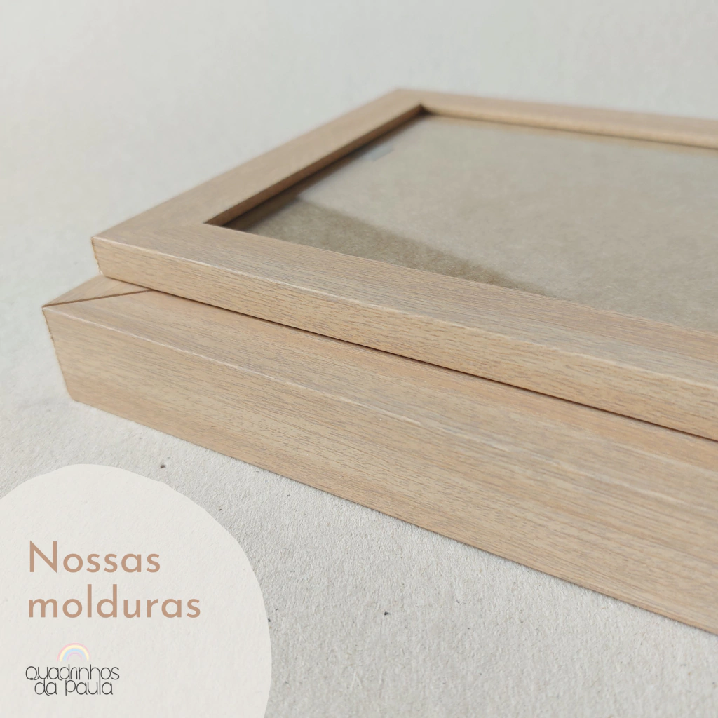 - moldura de madeira de reflorestamento com vidro frontal e eucatex ao fundo, com gancho pendurador que pode ser removido caso prefira, ao invés de pendurar, fixar os quadros com fita dupla face